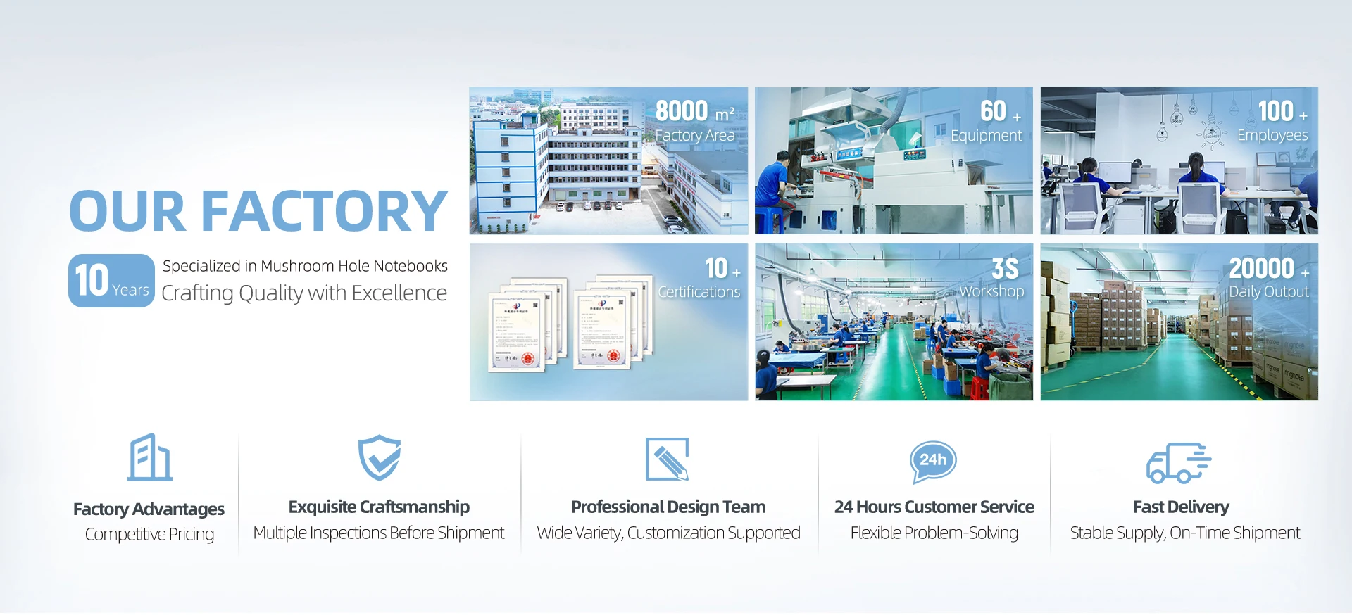 Productos principales:Cuaderno encuadernado en disco, planificador encuadernado en disco, discos de plástico, álbum de tarjetas, funda para tarjetas